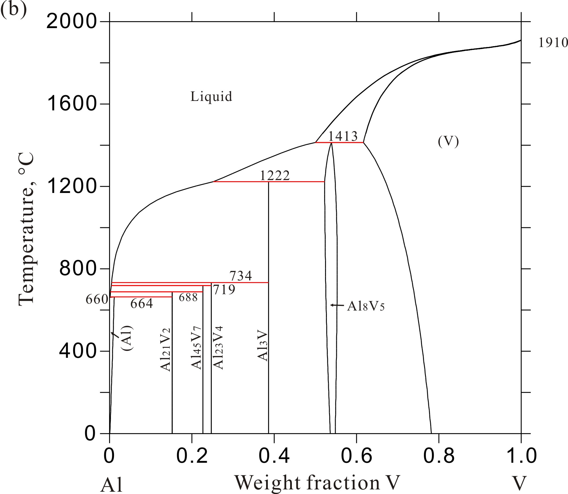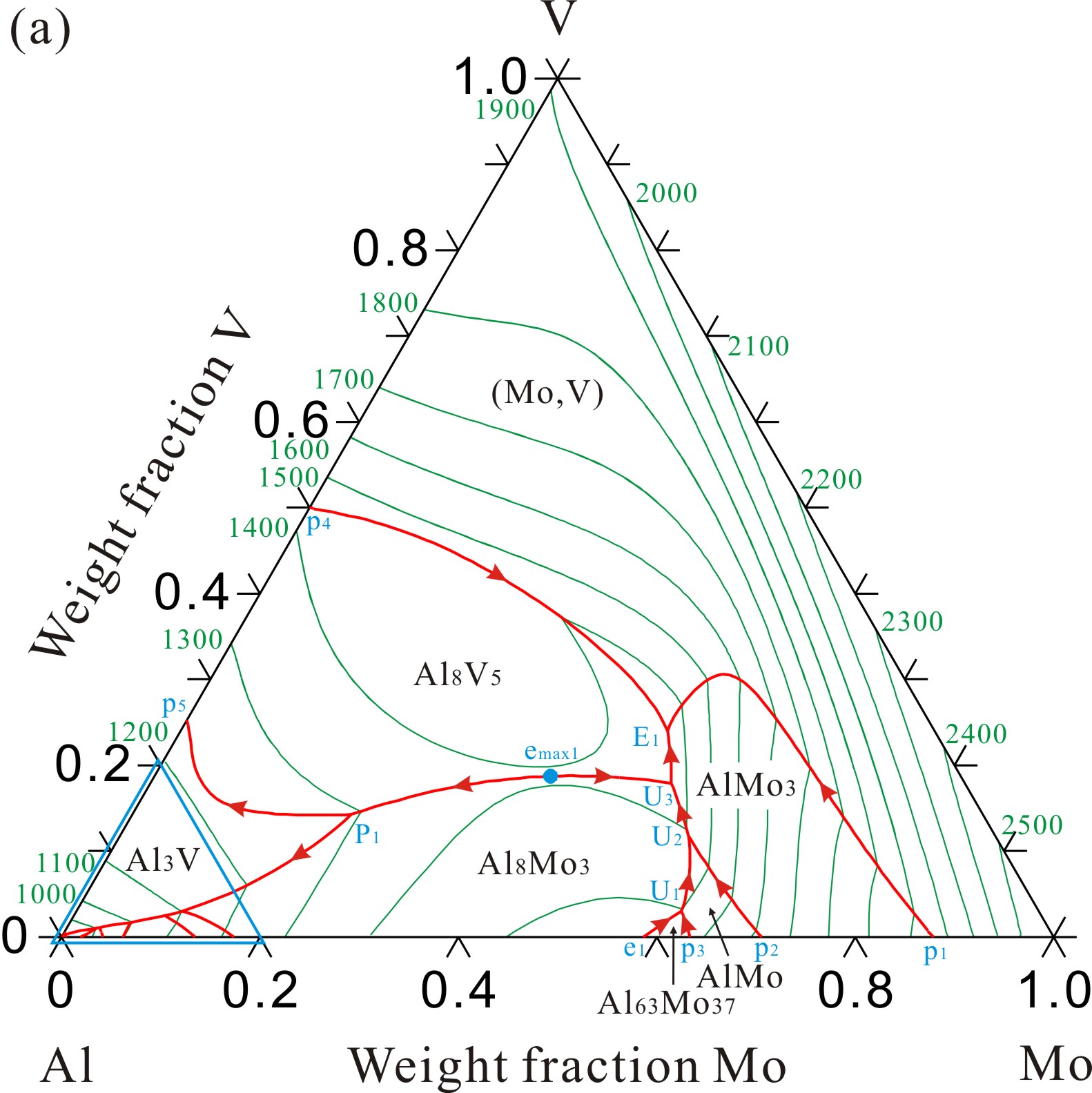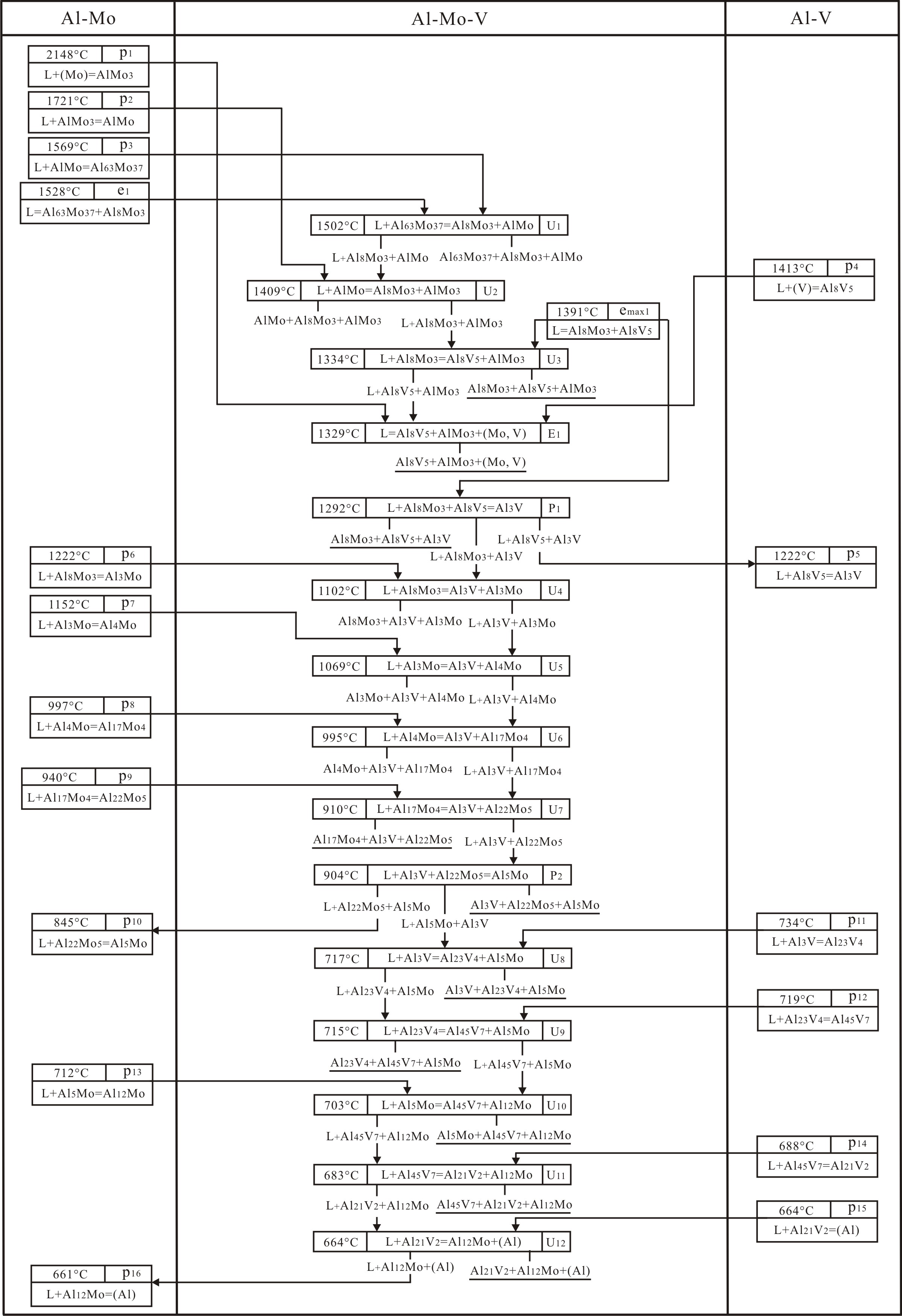 Thermodynamic assessment of the Al–Mo–V ternary system was performed by means of the CALPHAD (CALculation of PHAse Diagram) approach based on the thermodynamic descriptions of three constitutive binary systems (Al–Mo, Al–V and Mo–V) as well as the experimental phase equilibria data available in the literature. The solution phases, i.e. liquid, bcc (Mo, V) and fcc (Al), were described using the substitutional solution models with the Redlich-Kister equation. The binary phases in the Al–Mo and Al–V systems with the solubilities of the third element were modeled using the sublattice models. An optimal set of thermodynamic parameters for the Al–Mo–V system was obtained. Six isothermal sections at 1200, 1000, 750, 715, 675 and 630 oC and liquidus projection with isotherm were calculated. The reaction scheme for the entire Al–Mo–V system was also constructed. Comparisons between the calculated and measured phase diagrams indicated that almost all the reliable experimental information was satisfactorily accounted for by the present modeling.
