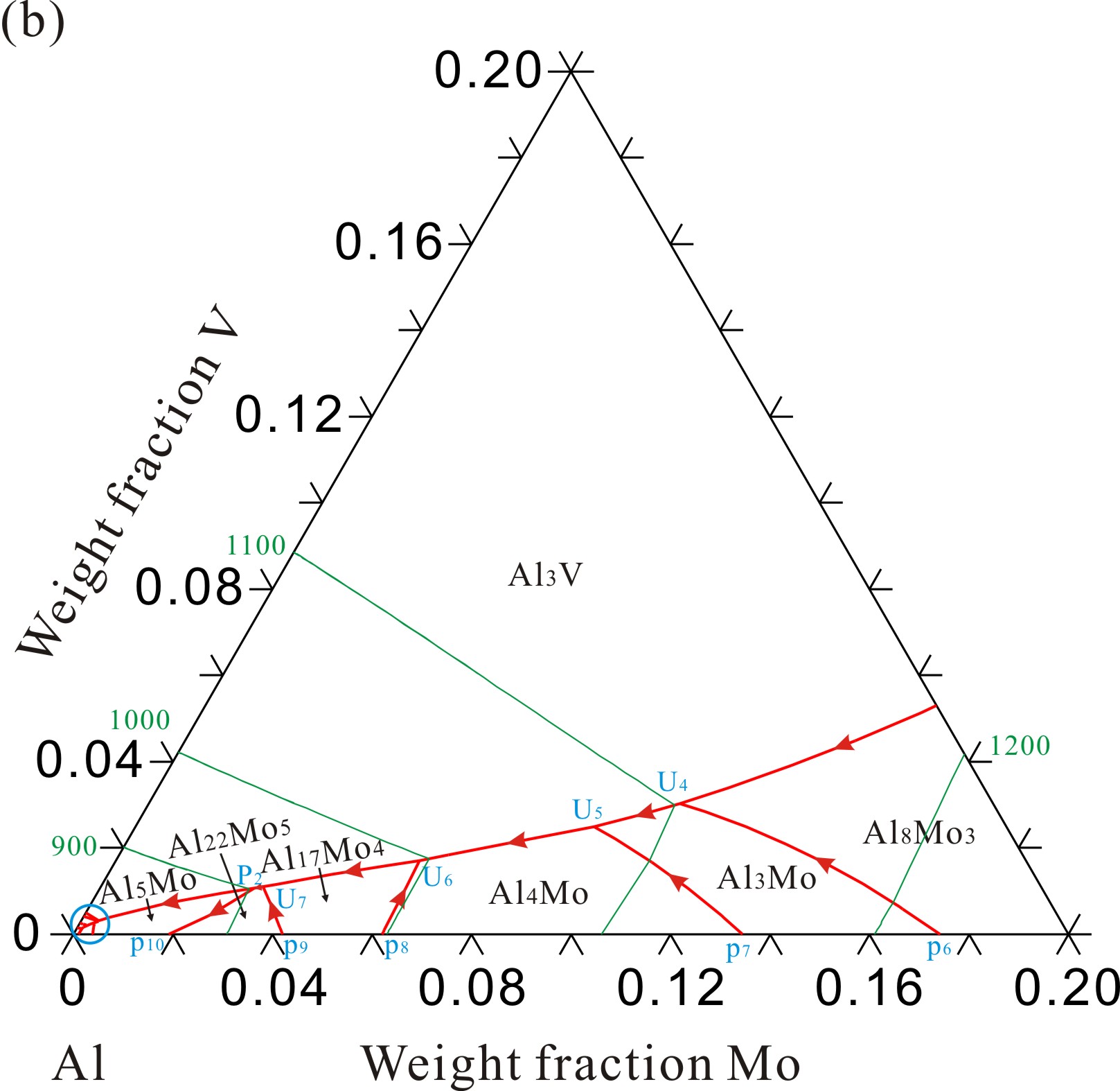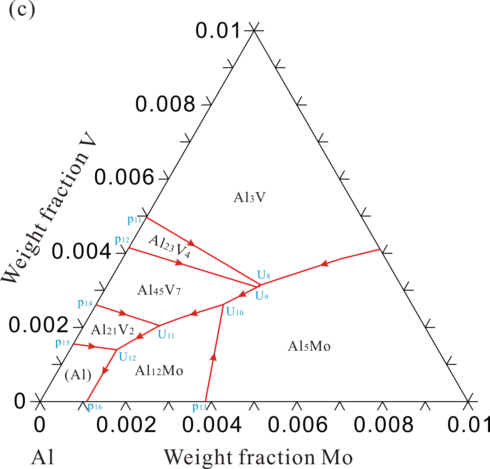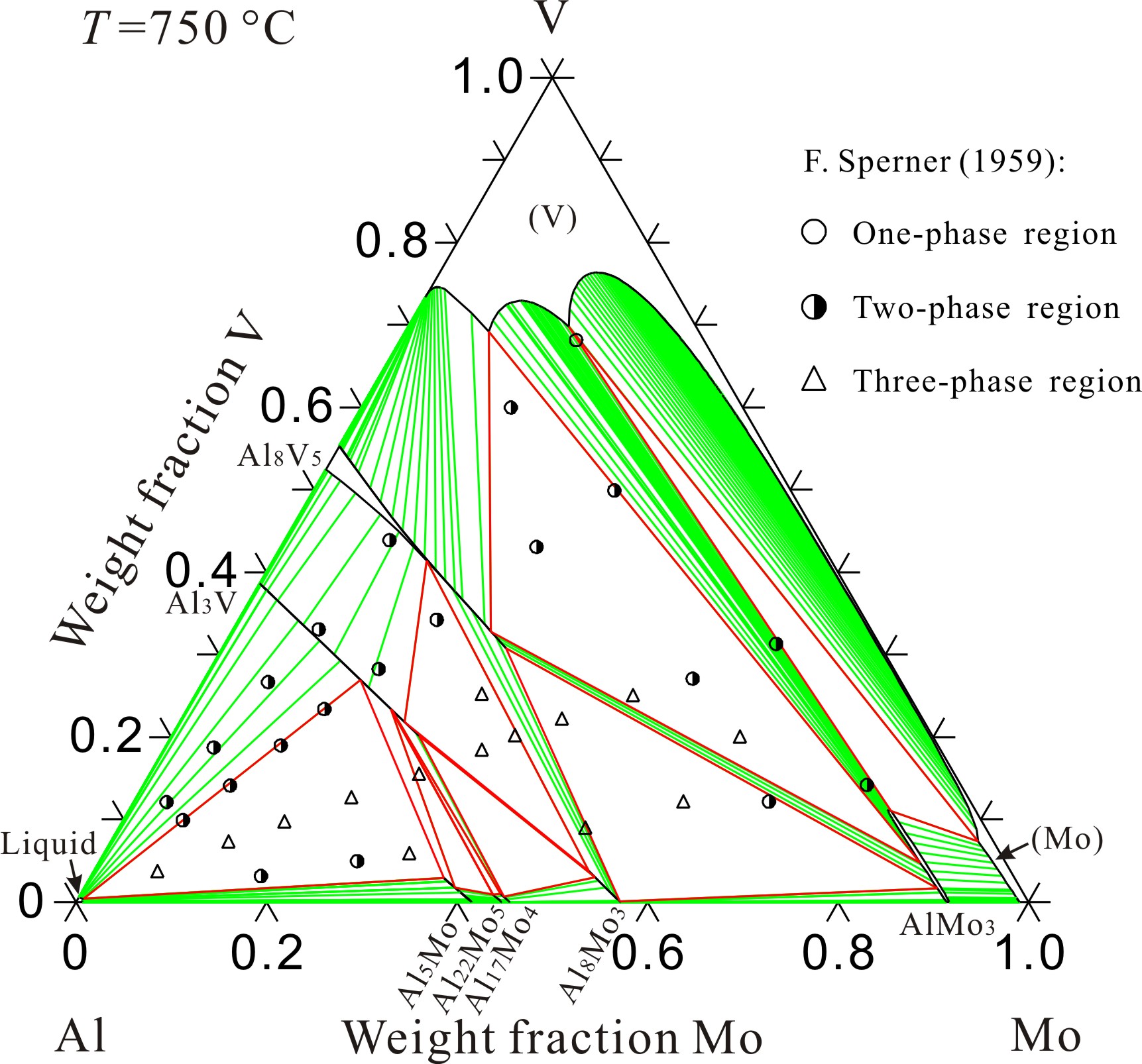 Thermodynamic assessment of the Al–Mo–V ternary system was performed by means of the CALPHAD (CALculation of PHAse Diagram) approach based on the thermodynamic descriptions of three constitutive binary systems (Al–Mo, Al–V and Mo–V) as well as the experimental phase equilibria data available in the literature. The solution phases, i.e. liquid, bcc (Mo, V) and fcc (Al), were described using the substitutional solution models with the Redlich-Kister equation. The binary phases in the Al–Mo and Al–V systems with the solubilities of the third element were modeled using the sublattice models. An optimal set of thermodynamic parameters for the Al–Mo–V system was obtained. Six isothermal sections at 1200, 1000, 750, 715, 675 and 630 oC and liquidus projection with isotherm were calculated. The reaction scheme for the entire Al–Mo–V system was also constructed. Comparisons between the calculated and measured phase diagrams indicated that almost all the reliable experimental information was satisfactorily accounted for by the present modeling.