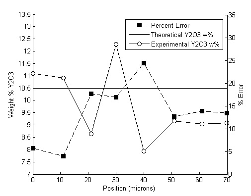 - Figure 4: (a) Membrane exposed to CaO impurity, (b) Membrane exposed to SiO2 impurity, (c) Membrane exposed to Na2O/Na2O2 impurity, (d) Yttria and zirconia concentration profiles as a function of position in YSZ membrane samples exposed to impurities.