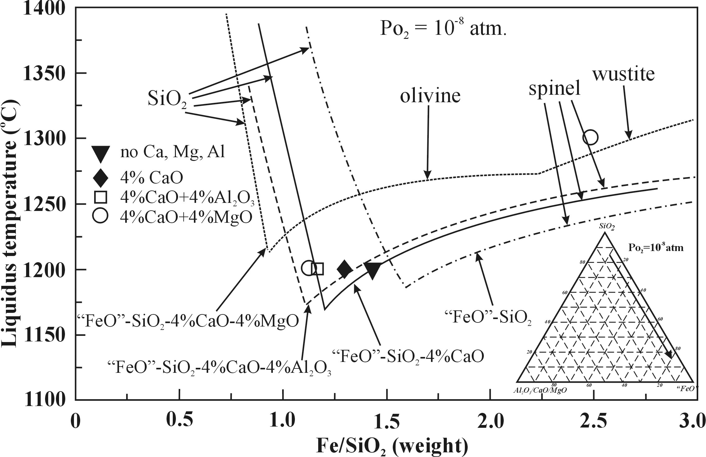 It was found that spinel and silica are major primary phases in the composition range related to copper smelting/converting slags. In addition, olivine, diopside and pyroxene also appear at certain conditions. The presence of CaO, MgO and Al2O3 in the slag increases the spinel liquidus and decreases the silica liquidus. Liquidus temperatures in silica primary phase field are not sensitive to Po2; Liquidus temperatures in spinel primary phase field increase with increasing Po2. At 1300 oC and low Po2, the spinel (Fe2+,Mg2+)O.(Al3+,Fe3+) primary phase field can be replaced by wustite (Fe2+,Mg2+)O.References