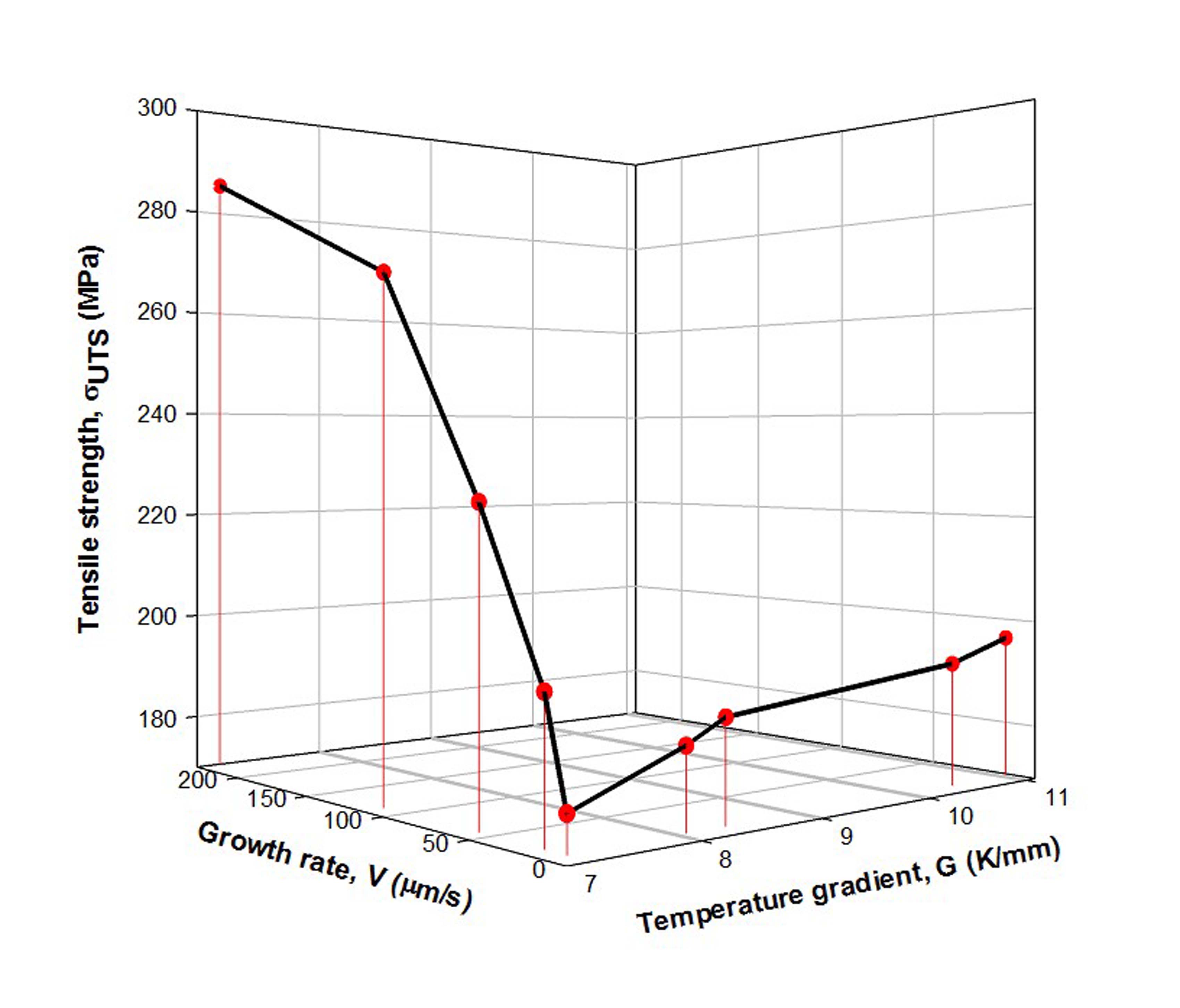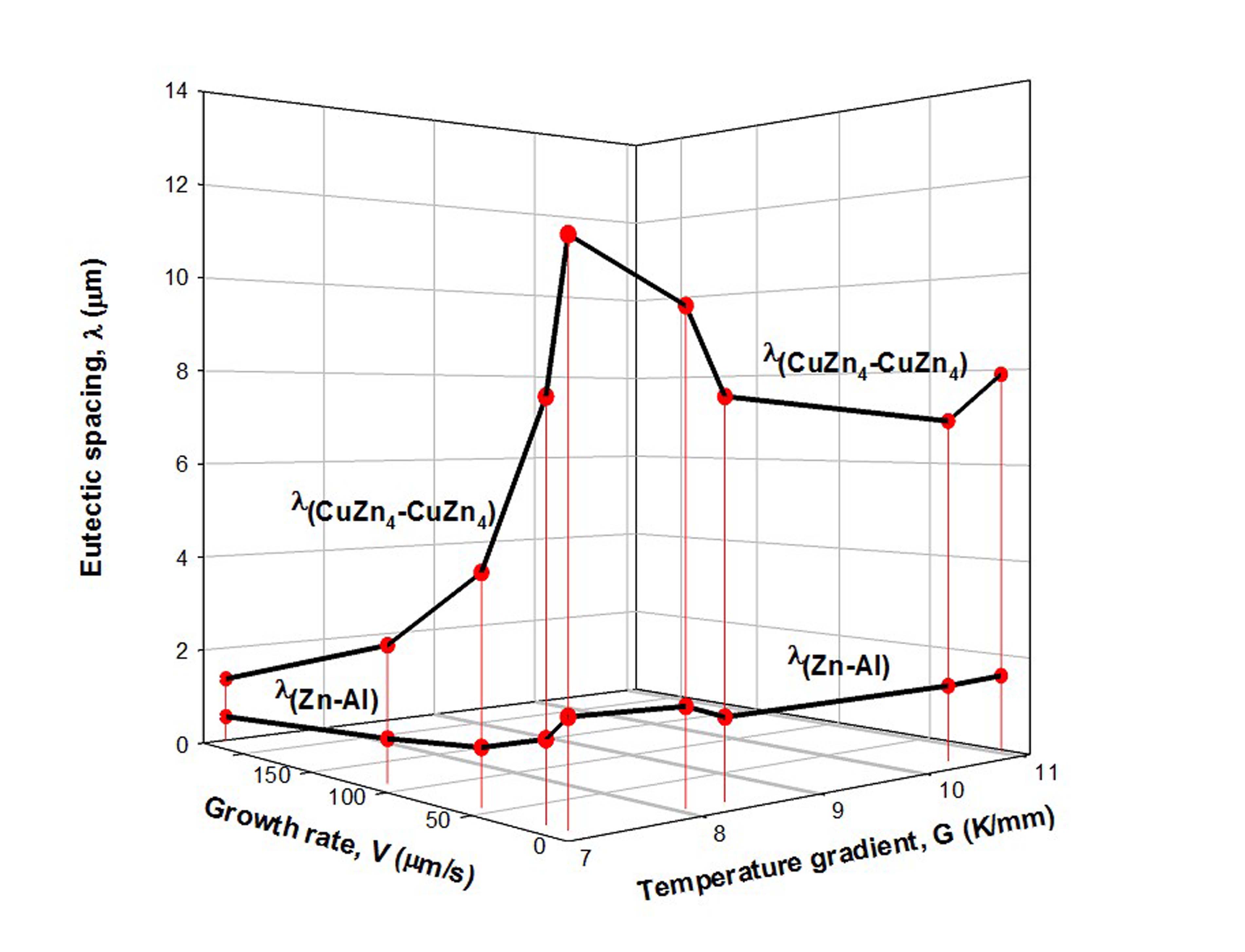 In the present work, the effect of growth rate and temperature gradient on microstructure and mechanical properties of Zn–7wt.%Al–4wt.%Cu eutectic alloy has been investigated. Alloys prepared under steady-state conditions by vacuumed hot filing furnace. Then, the alloys were directionally solidified upward with different growth rates (V=11.62–230.77 mm/s) at a constant temperature gradient (G=7.17 K/mm) and with different temperature gradients (G=7.17–11.04 K/mm) at a constant growth rate (V=11.62 mm/s) by a Bridgman furnace. The microstructures were observed to be lamellae of Zn, Al and broken lamellae CuZn4 phases from quenched samples. The values of eutectic spacing, microhardness and ultimate tensile strength of alloys were measured. The dependency of the microstructure and mechanical properties on growth rate and temperature gradient were investigated using regression analysis.