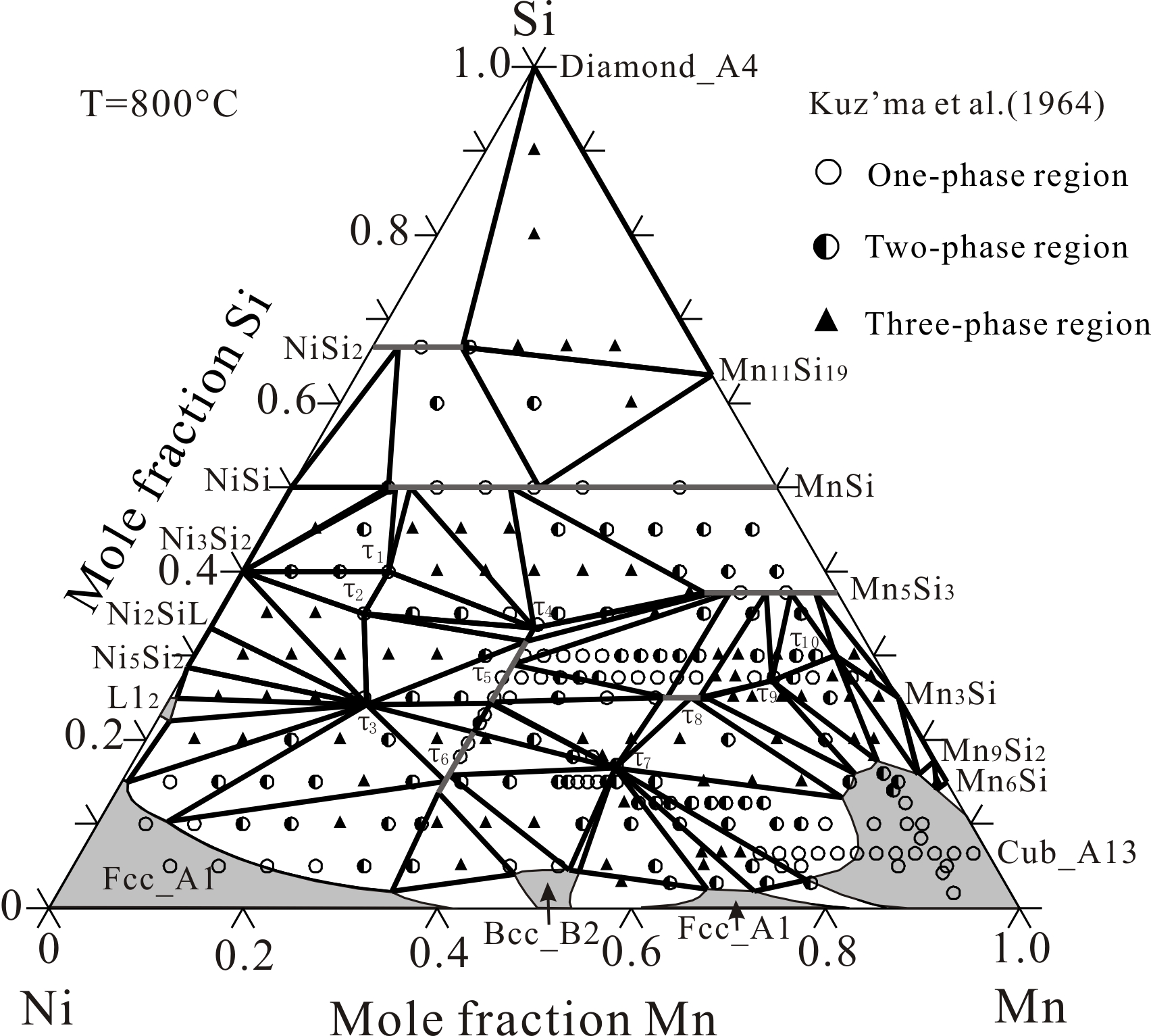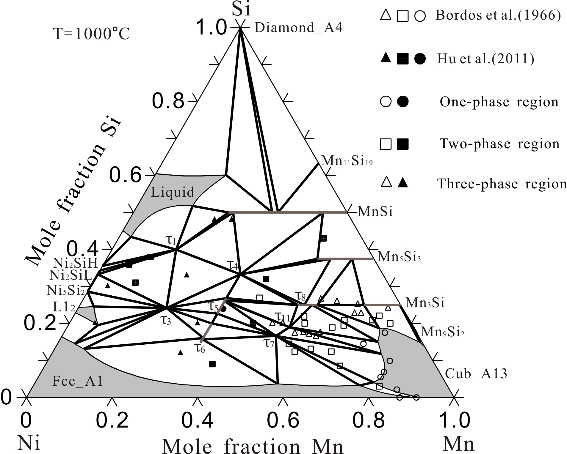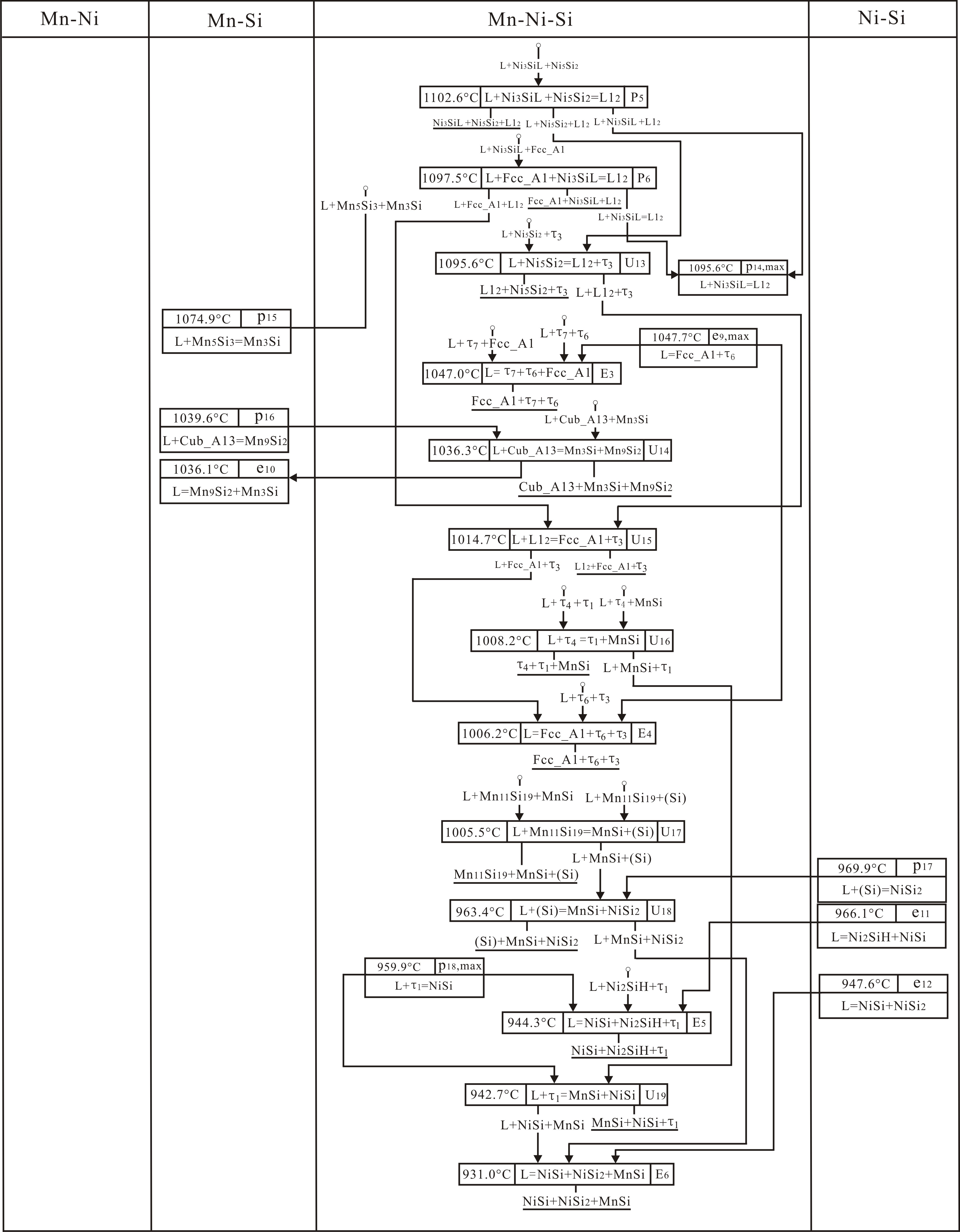 Based on the new experimental data available in the literature, the Mn-Ni-Si system has been reassessment using the CALPHAD (CALculation of PHAse Diagram) approach. Compared with the previous modeling, the τ8 and τ12 ternary phases were treated as the same phase according to the new experimental data. The Mn3Si phase was described with two sublattice model (Mn, Ni)3(Si)1. The reported new ternary phase τ was not considered in the present work. Comprehensive comparisons between the calculated and measured phase diagrams showed that a set of thermodynamic parameters of the Mn-Ni-Si system obtained in this work was more accurate than the previous one.