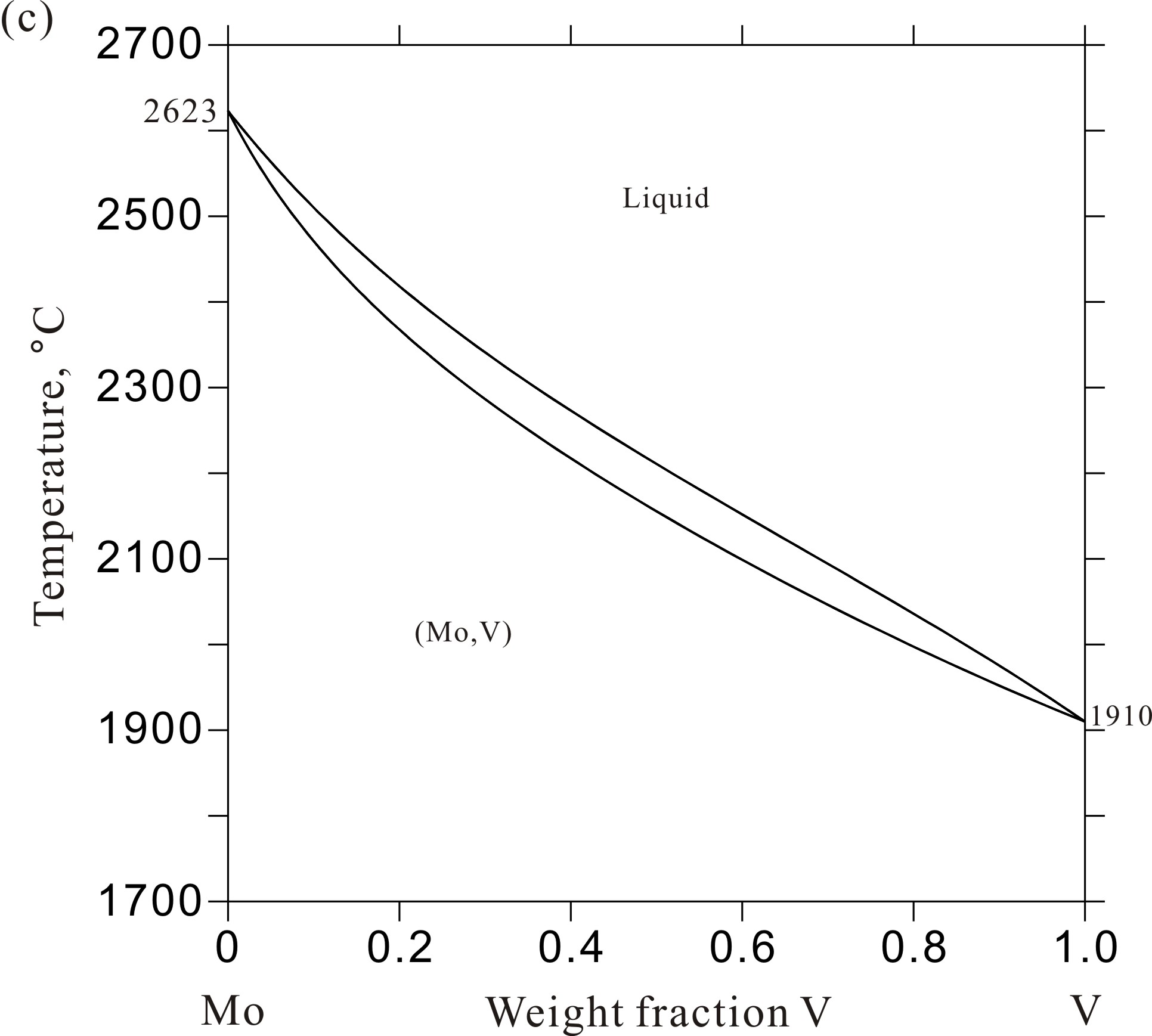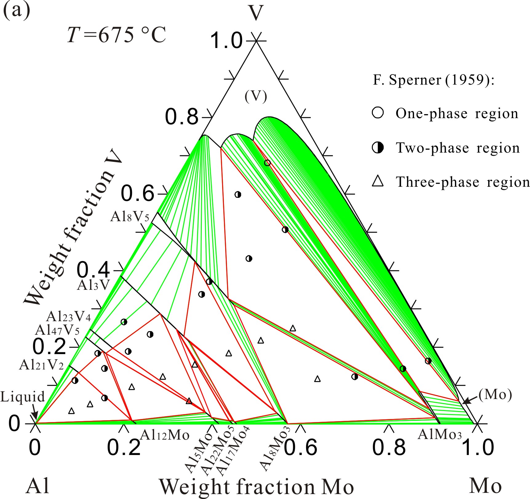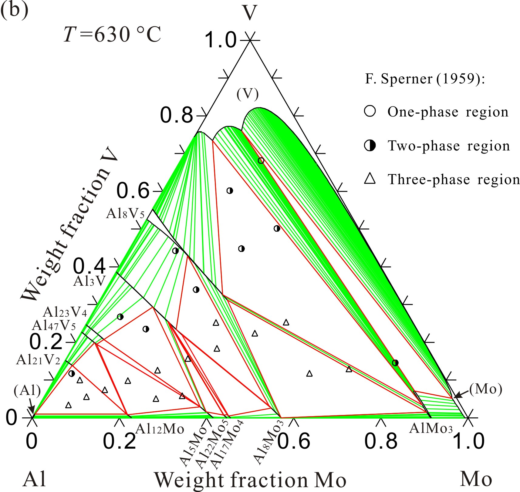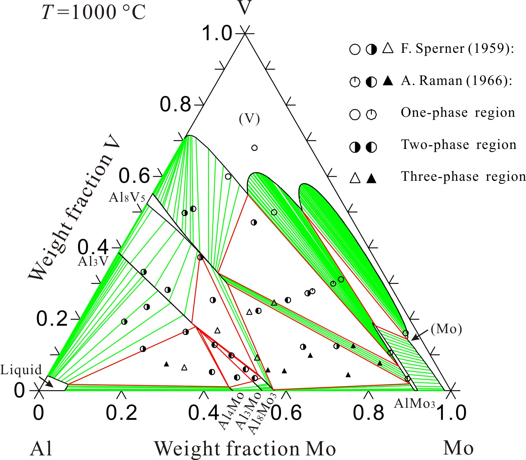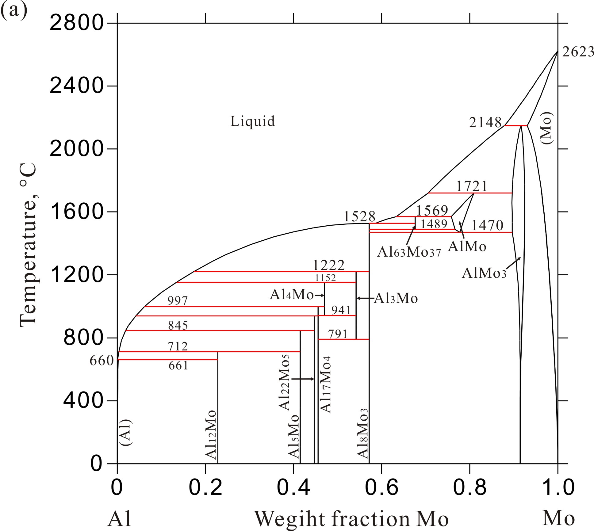 Thermodynamic assessment of the Al–Mo–V ternary system was performed by means of the CALPHAD (CALculation of PHAse Diagram) approach based on the thermodynamic descriptions of three constitutive binary systems (Al–Mo, Al–V and Mo–V) as well as the experimental phase equilibria data available in the literature. The solution phases, i.e. liquid, bcc (Mo, V) and fcc (Al), were described using the substitutional solution models with the Redlich-Kister equation. The binary phases in the Al–Mo and Al–V systems with the solubilities of the third element were modeled using the sublattice models. An optimal set of thermodynamic parameters for the Al–Mo–V system was obtained. Six isothermal sections at 1200, 1000, 750, 715, 675 and 630 oC and liquidus projection with isotherm were calculated. The reaction scheme for the entire Al–Mo–V system was also constructed. Comparisons between the calculated and measured phase diagrams indicated that almost all the reliable experimental information was satisfactorily accounted for by the present modeling.