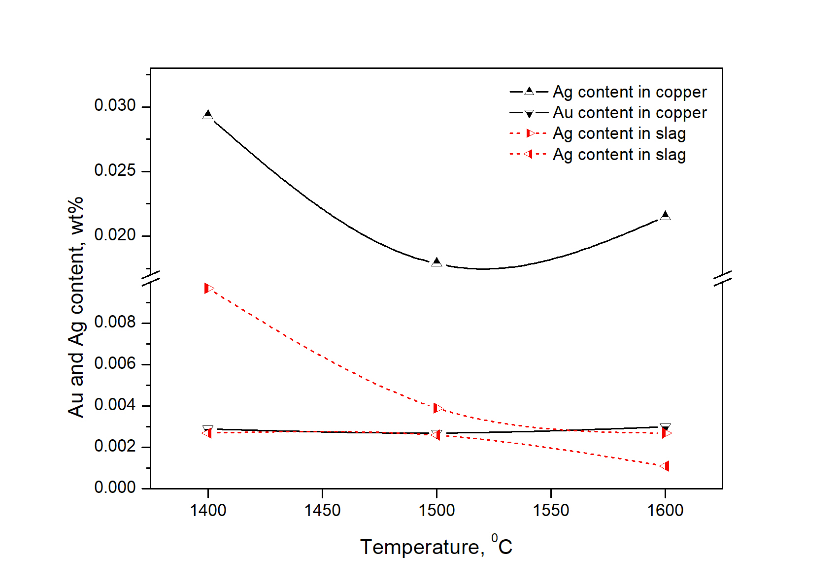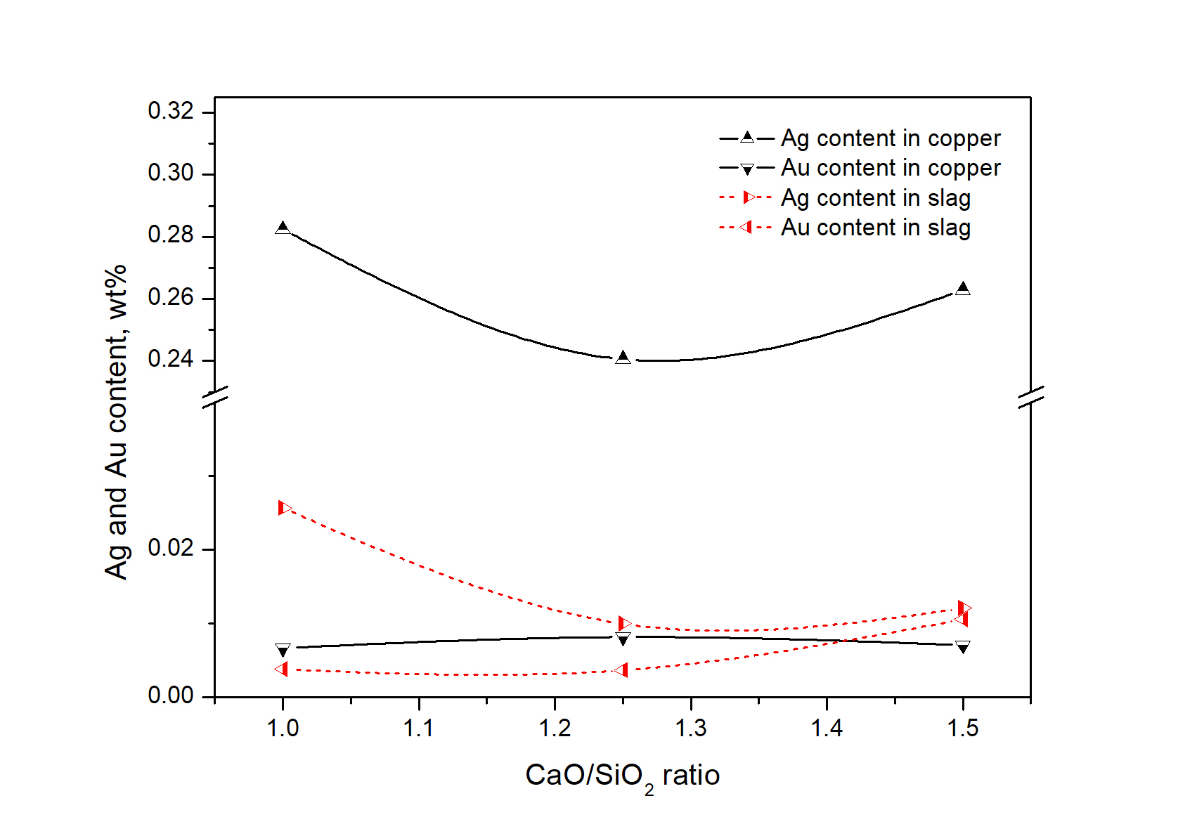 Gold mine tailings may contain relatively high concentrations of valuable metals such as iron, copper and zinc and occasionally, even precious metals such as gold and silver. The Au and Ag concentrations in the tailings from gold mining in Jeonnam Province are 110 mg/kg and 3 380 mg/kg, respectively. Their major components are SiO2, Fe2O3 and Al2O3, but they also contain reactive sulphide minerals such as pyrite. We used high temperature smelting and additives to dissolve Au and Ag from the gold mine tailings into the molten copper. Gold greatly dissolved (82 mg/kg Au in the molten copper) at 1600 °С under a CaO/SiO2 ratio of 1.25, suggesting the increase in the dissolution of gold with the decreasing viscosity of the molten tailings at high temperatures.