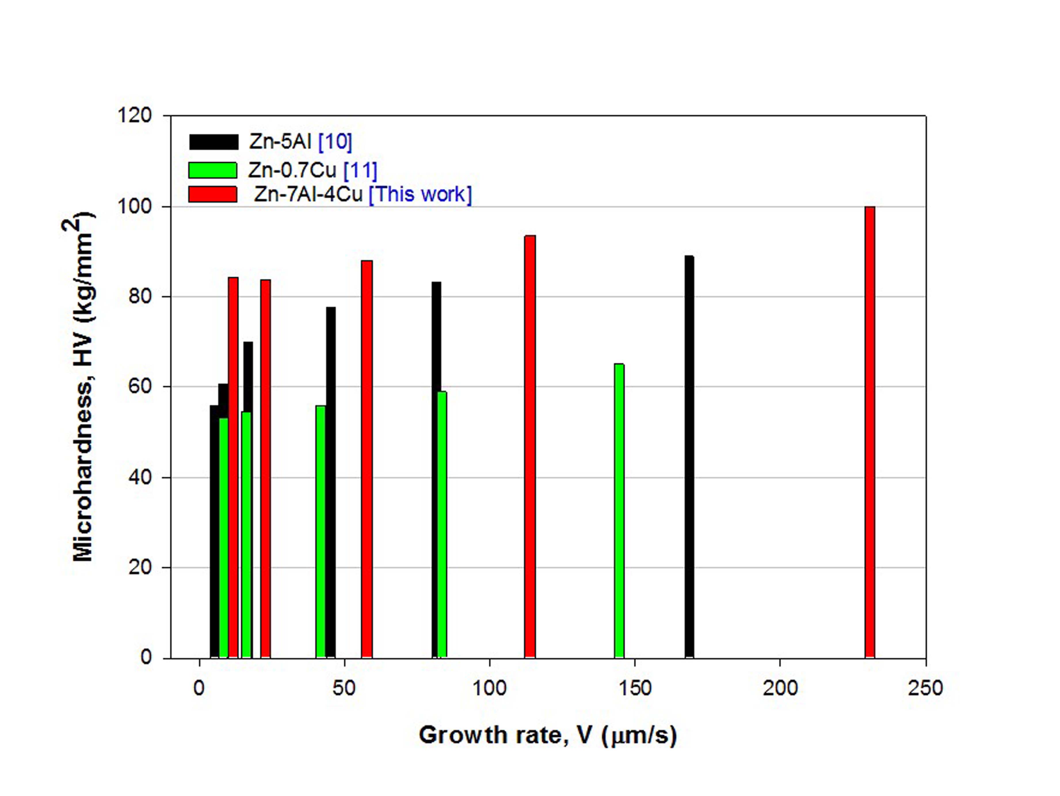 In the present work, the effect of growth rate and temperature gradient on microstructure and mechanical properties of Zn–7wt.%Al–4wt.%Cu eutectic alloy has been investigated. Alloys prepared under steady-state conditions by vacuumed hot filing furnace. Then, the alloys were directionally solidified upward with different growth rates (V=11.62–230.77 mm/s) at a constant temperature gradient (G=7.17 K/mm) and with different temperature gradients (G=7.17–11.04 K/mm) at a constant growth rate (V=11.62 mm/s) by a Bridgman furnace. The microstructures were observed to be lamellae of Zn, Al and broken lamellae CuZn4 phases from quenched samples. The values of eutectic spacing, microhardness and ultimate tensile strength of alloys were measured. The dependency of the microstructure and mechanical properties on growth rate and temperature gradient were investigated using regression analysis.